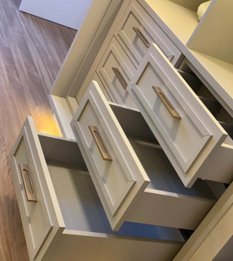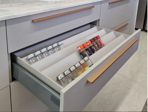Utilização de dobradiças com amortecimento HETTICH e BLUM. Corrediças ocultas (com extração total) e articuladores com amortecimento da marca HAFELE e BLUM (conforme projeto).